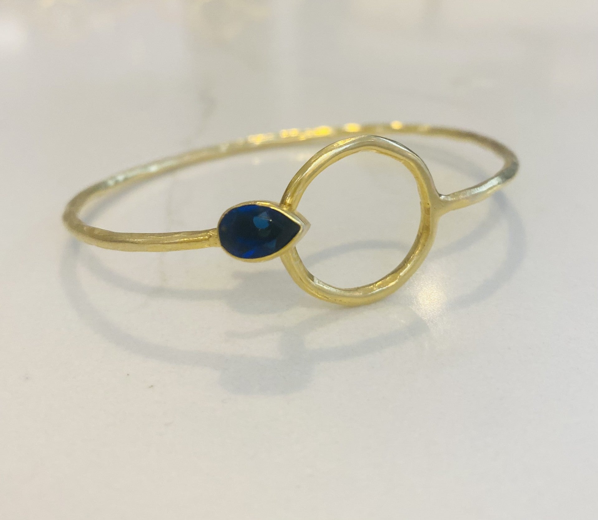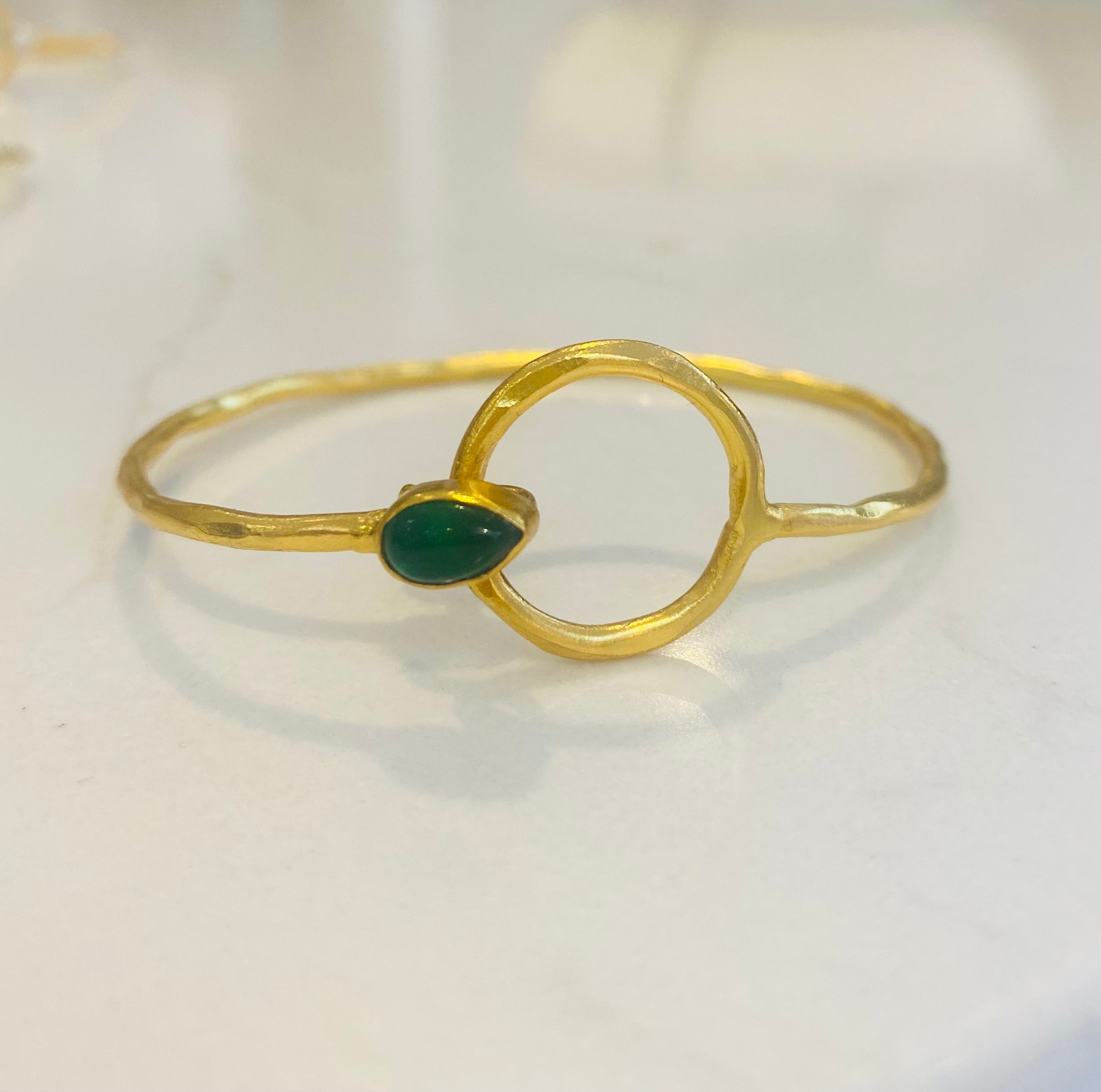 Classic bangle bracelet with circular hoop and semi precious stones in gold and silver. Hammered texture with easy to fasten clip that hooks under the hoop.