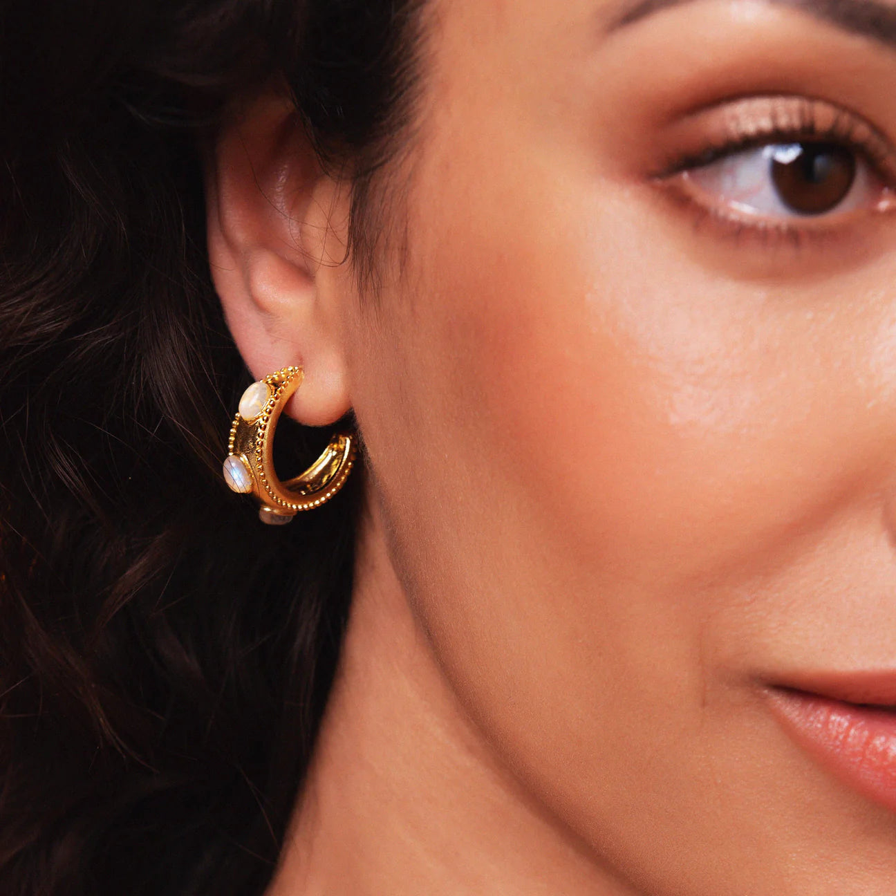 You can never have enough hoop earrings. Say hello to the Daphne hoop earrings, a vintage mini hoop design set with 4 beautiful gemstones. Size 2.5 cms, 22 carat gold plated.